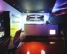 当社にしては珍しく都心のビルインタイプのスロット店 担当は、新進気鋭の男性の若手ホープ“佐藤芳樹”アクリルの発光特性(平面から入った光を小口から出す性質)を利用した手法は、照度の少ないスロット店のインテリアに新しい可能性を見出した 密度の高い、経営者もデザイン担当者も(客層も若い)好作品 |