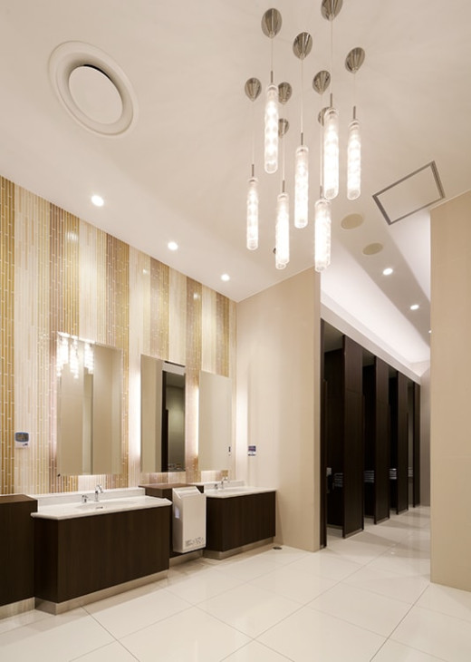 白を基調としたシンプルな外観の店舗です。外観には石調を使用しておりますので、凛とした佇まいの建築デザインとなりました。夜のライトアップでは、所々にオレンジのライ・・・