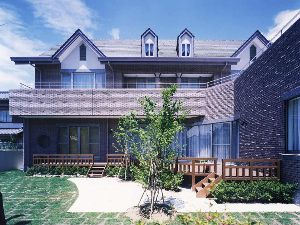 広々としたウッドデッキとバルコニーが印象的な住宅です。